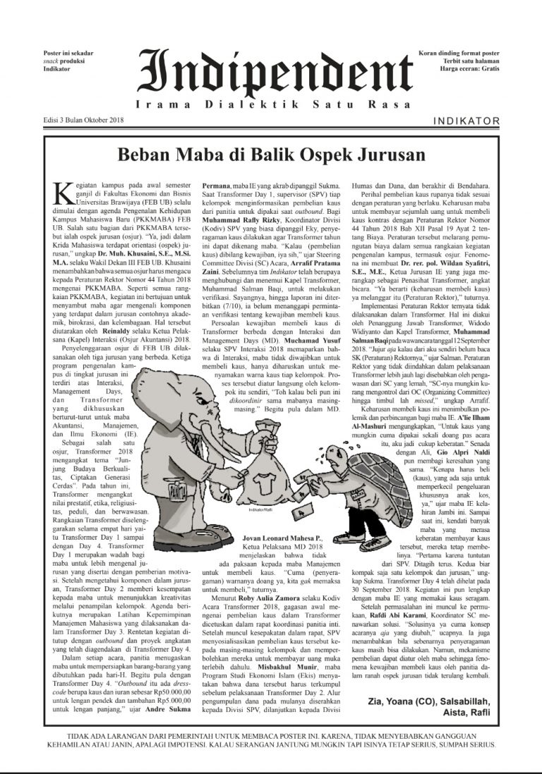 Ospek Malam, Kehadiran Maba Dipertanyakan lpmindikatorOctober 9, 2018 Indipendent merupakan salah satu produk yang diterbitkan oleh LPM Indikator dalam bentuk Koran Dinding. Indipendent berisi ulasan mengenai isu di lingkup Fakultas Ekonomi dan Bisnis Universitas Brawijaya. Klik di sini untuk mengunggah. Ospek-Malam-Kehadiran-Maba-Dipertanyakan-1