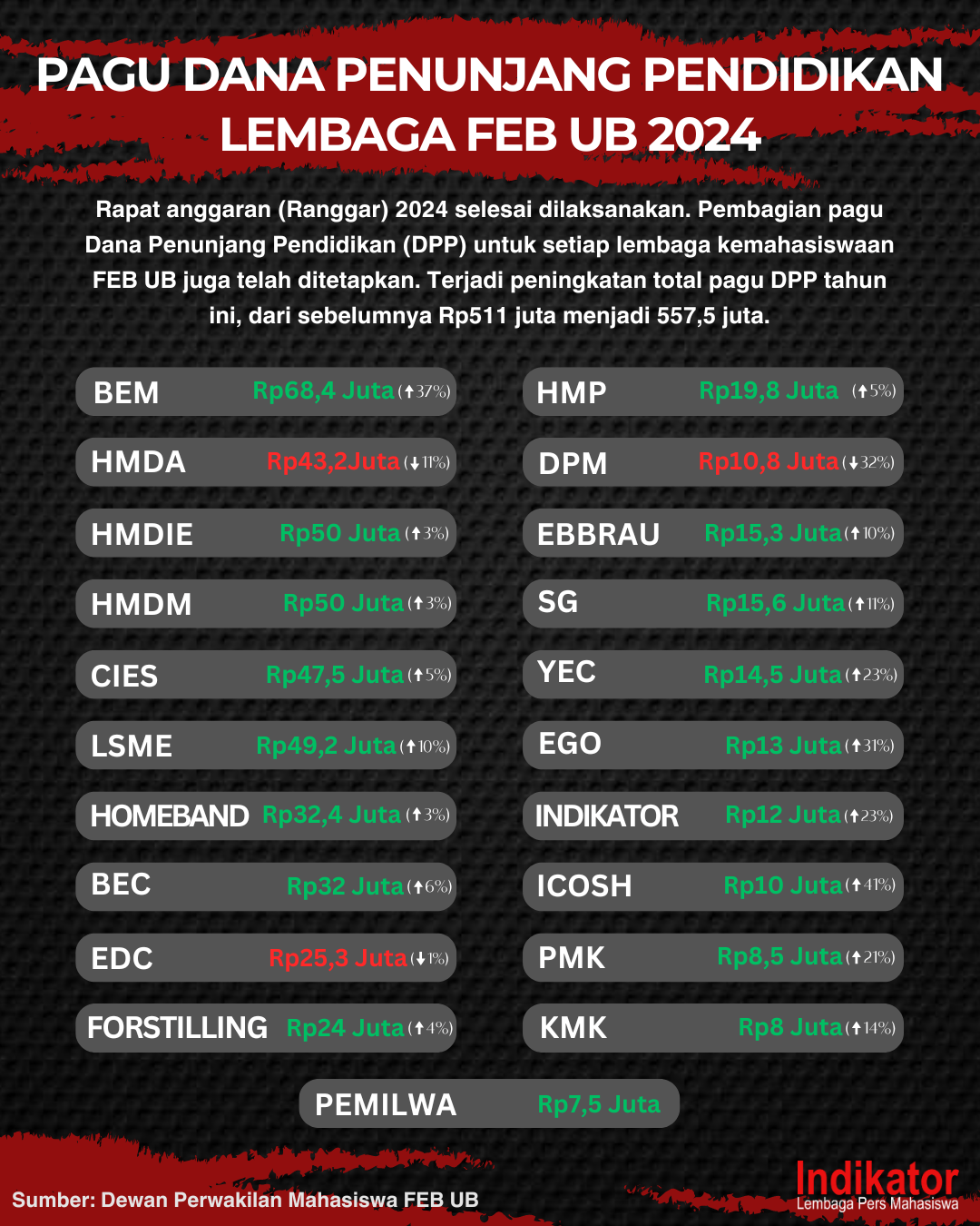 Rapat anggaran (Ranggar) 2024 selesai dilaksanakan. Pembagian pagu Dana Penunjang Pendidikan (DPP) untuk setiap lembaga kemahasiswaan FEB UB juga telah ditetapkan. Terjadi peningkatan total pagu DPP tahun ini, dari yang sebelumnya 511 juta menjadi 557,5 juta.