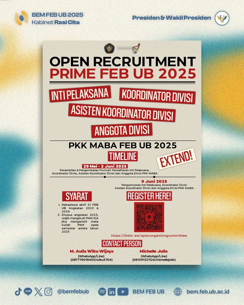 Panitia PKKMABA FEB UB melanjutkan rangkaian open recruitment dan akan mengumumkan struktur staf divisi pada 14 Juli 2025. Rangkaian ini merupakan upaya mereka untuk melengkapi susunan kepanitiaan yang hingga kini belum sepenuhnya terbentuk. Sebelumnya, struktur lengkap kepanitiaan PKKMABA FEB UB dijadwalkan akan diumumkan pada 9 Juni lalu.